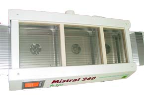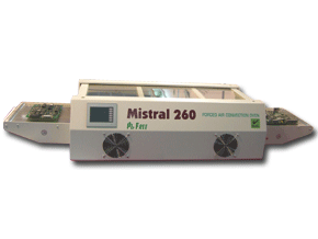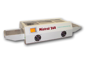 The Mistral 260 convection reflow soldering systems uses re-circulated hot air to accomplish reflow at much lower temperatures than IR systems. Using constant, even heating, a great variety of board sizes will reach reflow temperature with the same heat profile. By eliminating set-up time your production line can work to its fullest capacity.