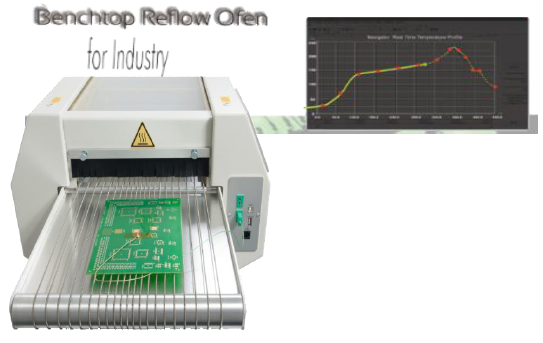 Reflow machine has three seperated heating zones(Preheating+ Soak + Reflow) and one cooling area. It adoptes vertical Full Hot Air Convection method and the special glass cover helps real-time inspection work. Chamber lighting unit can be selected (op).